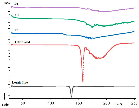 Thermograms of loratadine, citric acid, and mixtures are shown in Figure 2. The sharp endothermic peak crystalline loratadine and citric acid at 136.98 °C and 156.4 °C, respectively, showed the melting point of the substances, in good agreement with their reported values [19,21,38,39]. DSC curves of binary mixtures exhibited the lack of endothermic peaks corresponding to melting points of loratadine and citric acid and were distinctly different from the crystalline pure components, suggesting the formation of a new phase.