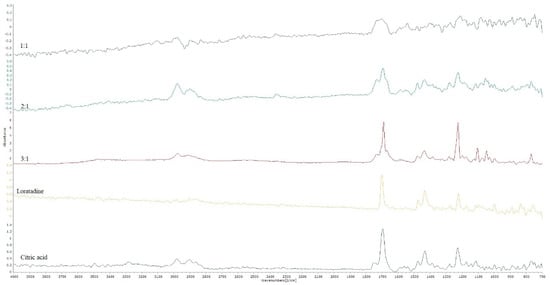 The FTIR spectra (Figure 3) of crystalline loratadine present characteristic peaks at 1701 cm−1 for C=O stretching vibrations of ester, 1560–1554 cm−1 stretching vibrations of the pyridine ring, and 1434 cm−1 stretching vibrations of the benzene ring. Citric acid shows characteristic peaks at 3494 cm−1 for O-H stretching vibrations, 1751 cm−1, and 1704 cm−1 C=O stretching for COOH groups. The spectra of binary mixture systems present the modification of the absorption peaks of the C=O stretching vibration of loratadine from 1701 cm−1 to 1694 cm−1 and the COOH groups of citric acid from 1751 cm−1 to 1733 cm−1. Our results were in accordance with the findings of Wang et al. [19].