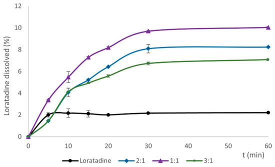The dissolution (Figure 4) of crystalline loratadine at each point of the dissolution curve is lower than the dissolution of the binary system. Binary mixtures at 2:1 and 3:1 ratios presented a lower dissolved amount of loratadine after 5 min compared to the 1:1 system, but after 60 min there was a three to four-fold increase in the dissolved amount of loratadine. The dissolution percentage of the co-amorphous system 1:1 at 60 min was a five-fold amount of pure loratadine (10% and 2.2%, respectively).