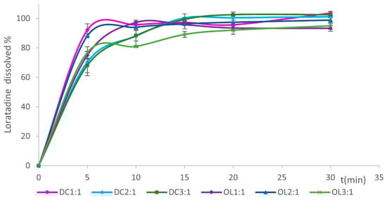 The dissolution test was performed with Biobase BK-RC3 apparatus with a rotating basket, in 200 mL of distilled water, at a rotation speed of 50 rpm and a temperature of 37 ± 0.5 °C. Accurately weighted amounts corresponding to 10 mg of loratadine were used. After 5, 10, 15, 20, 30, and 60 min, 5 mL aliquots were removed and replaced with fresh distilled water. After filtration through a 0.45 µm filter, loratadine content was determined using UV spectroscopy with the apparatus UV-1800 240V IVDD, Shimadzu (UV-VIS) at a wavelength of 248 nm. All dissolution samples were performed in triplicates.
