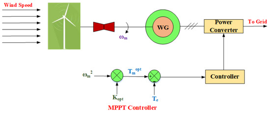 Modeling of WT was performed according to Equations (1)–(6), as shown in Figure 1. The WE power capture is maximized at different wind speeds; the VSWG has the capability to do this for a wide speed range. PAC, one of the software solutions, assists in FRT by keeping the generator operating at rated wind speeds. When a WT is exposed to wind gusts, PAC increases to reduce Cp by controlling the yaw mechanism, and therefore, output power decreases where PA equals zero at normal wind speeds are shown in Figure 2. A variety of MPPT control strategies have been developed, thence MPPT with optimal torque control (OTC) is proposed to be applied due to its merits, such as its power smoothing capability. Figure 3 shows the OTC-MPPT algorithm of WECS.