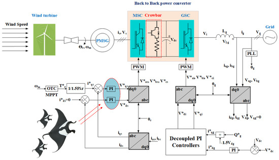 The PMSWG model was run using a d-q equivalent electrical circuit. A full description of the proposed PMSWG with its control system is shown in Figure 4. The parameter definitions are found in [60]. Dynamic equations of the mathematical model are as follows [13,52]: