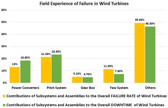 The failure ratio in WG components is shown in Figure 6 [62,63,64]. PAC systems and power converters represent a high ratio of failure for these components, and this is due to the mechanical stress that happens due to the nature of wind speed and faults, where faults lead to an increase in the speed of WG. Thus, protection topologies have great importance, and aid in decreasing the failure ratio [60,65,66]. Manufacturers and technologies for the top five WTs are shown in Table 3. From this table, it can be deduced that the PMSWG and DFIWG are produced by dominant manufacturing companies. With the fastest growth rate in WE between 2009–2018, full-scale power converter WGs, such as the PMSWG, have become dominant in the WE market. Table 4 indicates the top ten biggest turbines [8,9].
