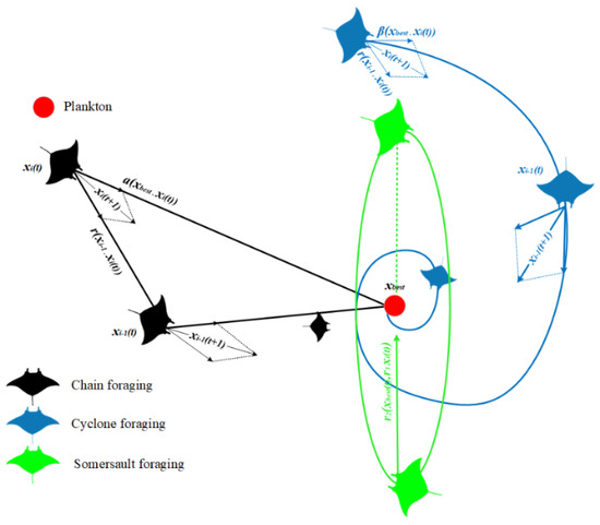 A novel meta-heuristic technique called MRFO is motivated by the smart and strategic behavior of manta rays (MRs) when they are looking for prey. It has already been demonstrated that using this approach to solve engineering challenges yields remarkably positive outcomes. Chain foraging, cyclone foraging, and somersault foraging are the three processes that the MRFO mimics in the MR eating technique, as depicted in Figure 7 [67,68,69].