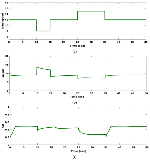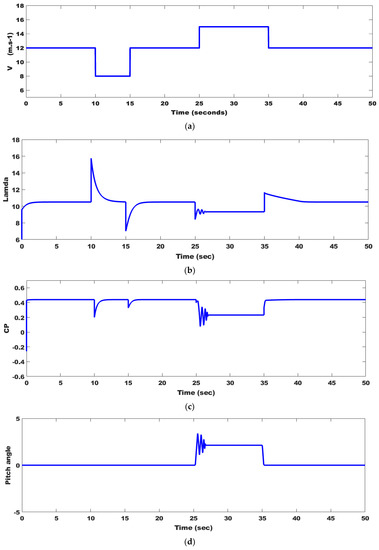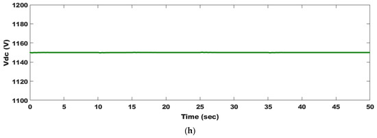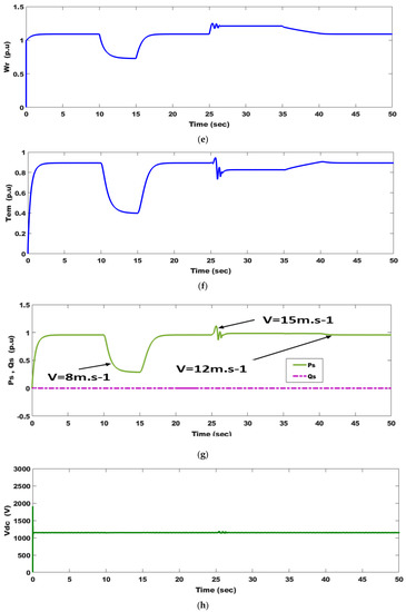 The studied system is illustrated in Figure 4, where the wind speed profile is applied to two worst case scenarios. In the former, a lower wind speed is applied to verify the system in extracting MPPT, and in the other case, the system is exposed to wind gusts to verify the effectiveness of PAC, as depicted in Figure 10a. If the PA equals zero, this signifies MPPT realization; if it is bigger than zero, this means the WG does not operate at MPPT to prevent the WT from wind gusts that may cause a failure in the system components. Figure 10b,c show both and where they quickly track the wind speed profile and achieve optimal values, respectively. affected by the step change in wind speed that is due to changes in and the earliest operator change, according to Equation (4). Figure 10d depicts the PAC response where the PA increases to reach 2.9740. Figure 10e,f display the changes in both and as a result of wind speed changes, respectively. Figure 10g depicts the injected P and Q to the grid as a result of wind speed changes. The Q is kept at zero because the system operates at unity power factor (UPF). Equations (1), (13), (14), and (15) give a strong explanation for , , and the P and Q responses, respectively. Figure 10h depicts that the is constant, indicating that all generated power is transferred into the grid. Oscillations that occur in the simulated parameters are very small and indicate the success of PAC and OTC in the presence of MRFO-PI controllers.