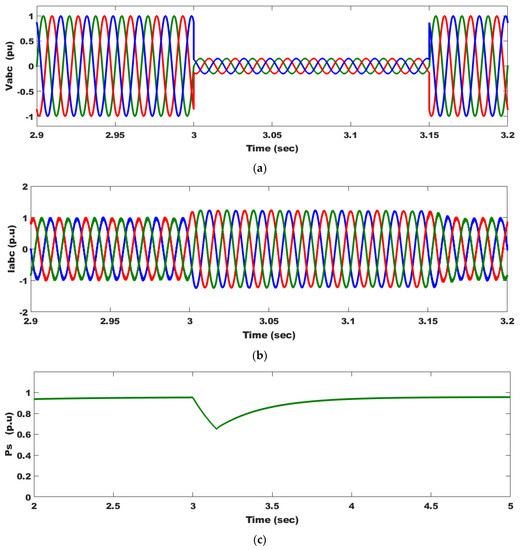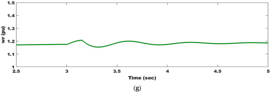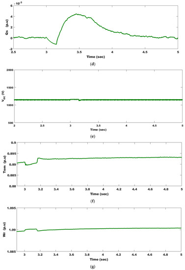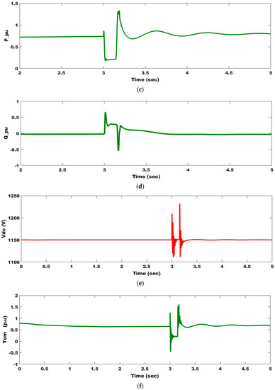 Transient response enhancement during and after clearing the fault becomes a crucial requirement for new grid codes. The fault is assumed to occur at 3 s and cleared at 3.15 s in the grid voltage, as seen in Figure 11a, and wind speed is constant at 12 m·s−1. During the fault period, both P and decrease, as seen in Figure 11c,f, respectively, but an increase occurs in I, Q, , and as seen in Figure 11b,d,e,g, respectively, because of this voltage dip. The braking chopper gets rid of surplus power by dissipating it in the form of thermal power to keep in the whole rated range. The proposed technique is successful in this issue where the overshoot of P, oscillations in , and all parameters are damped. Injection of Q after clearing the fault and the PMSWG maintaining grid connection shows FRT capability realization.