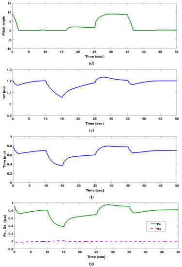 The investigated wind system is shown in Figure 5. Figure 12a shows the variations in the studied wind speed profile. Both and are depicted in Figure 12b,c, respectively, and they quickly track the wind speed profile and achieve their desired values. In response to a step change in wind speed, is impacted by . Figure 12d depicts the PAC response where the PA increases to reach 9.8740. The PAC successfully prevents the DFIWG from overwinding speeds by increasing PA from when PA is larger than zero. The parameters and decrease to reduce output power until this gust disappears to keep the WT working. Figure 12e,f display the changes in both and as a result of wind speed changes, respectively. P and Q are shown in Figure 12g as a function of changing wind speeds. Due to the UPF operation, Q is maintained at zero. The unchanging in Figure 12h implies that all produced electricity is transmitted to the power grid. Very minor oscillations in the simulated parameters show the effectiveness of PAC and OTC in the presence of MRFO-PI controllers. The findings of the simulation indicate that the DFIWG has more variability than the PMSWG.