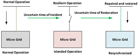 When calculating resilience, it is important to account for operational uncertainties, such as existing limits on normal and preincidence (PT) states, as well as mistakes in extreme weather forecasting, improper battery charging and discharging, inaccurate real-time and day-ahead market prices, and so on. The ability of a microgrid to recover from disruptions caused by catastrophic events (PR) such as the sudden shutdown of power generation units, the formation of unwanted islands, the occurrence of unsynchronized events, etc., must be estimated both during and after the occurrence of such events [25,26].