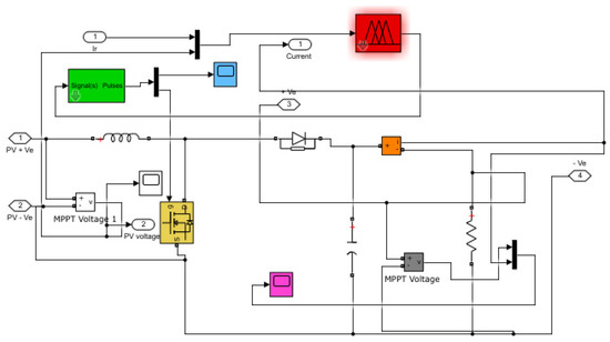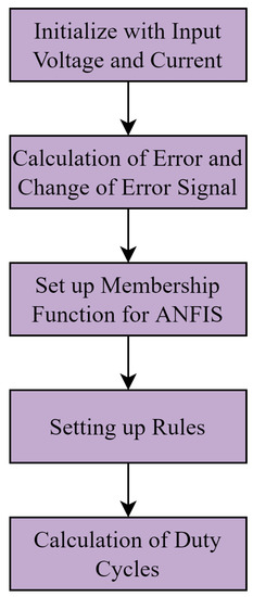 Fuzzy logic controllers (FLC) based on an adaptive neural network, or adaptive neuro fuzzy interface systems, are used in MPPTs (ANFIS). Because it does not require a precise mathematical model, ANFIS can handle a variety of inputs. There are three phases to the ANFIS: fuzzification, rule-based table lookup, and defuzzification. In the process of fuzzification, the membership functions are employed to convert quantitative inputs into linguistic variables. Most frequently, the MPPT ANFIS will take in the error (E) or the change in the error (E) as an input. The ANFIS input process begins with calculating the error (E) and the change in error (CE). FLC outputs typically display variations in duty ratio (represented here by a shift in duty cycle (D)). As can be seen in Figure 5, the ANFIS control method is implemented. These equations represent a model of the subsystem of the ANFIS controller [25]: