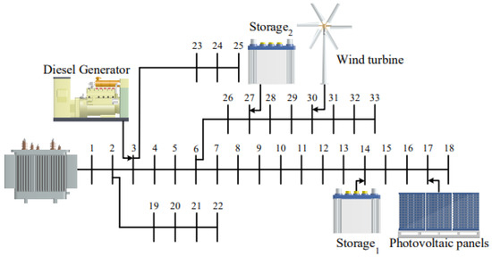 This research will model the proposed resilience mechanism using the IEEE 33-bus standard network and the ANFIS controller. To improve the existing AC power flow condition, two renewable distributed generators are wired into the grid at key buses. The model’s reliability has been increased thanks to the addition of two energy storage devices. In addition, a modest diesel generator is used to provide resilient and reliable operation, making it possible for the microgrid to serve as many loads as possible in the post-fault scenario. Diesel generator, solar unit, and wind power unit DER capabilities are 1400, 2000, and 1500 kW, respectively. Both ESSs have maximum capacities of 5500 and 4000 kW and utilize sodium–sulfur (NAS) batteries.