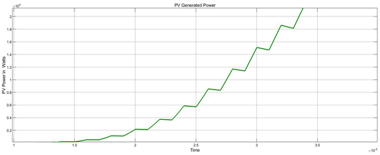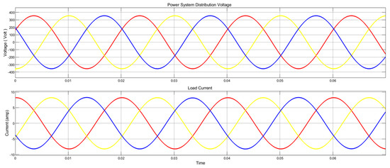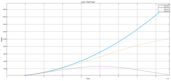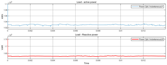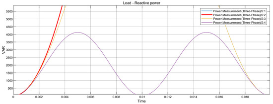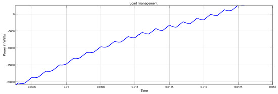 Instability and power imbalances can occur when a system’s load is increased. In order to prevent voltage swings and resolve power quality issues, controllers must first achieve a power balance between demand and supply. The controllers’ voltage response time improves by 0.25 s as the load doubles from 100 kW to 500 kW. While fuzzy PI can restore stability to a system, fuzzy PID can do it more quickly and to a greater extent. Accordingly, the voltage profiles of a bus with varying loads can be optimized. As seen in Figure 11, ANFIS will pick the power system for you automatically. Figure 12 depicts the distribution of reactive power throughout the load. Figure 13 depicts the current and load distribution for all three phases as recommended by the ANFIS controller. Moreover, the load management profile is shown in Figure 14. The wind-stabilized reactive and active power are shown in Figure 15. Also, the input actual real power of the load is shown in Figure 16.