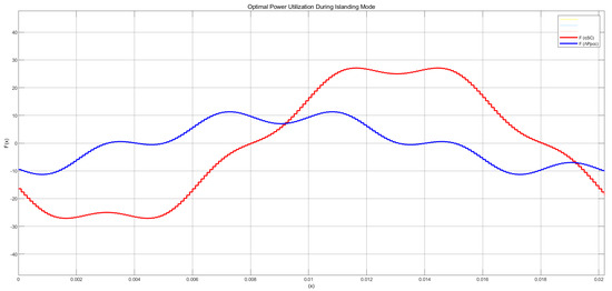 We determined that the error (e) could be calculated by dividing the d-q current value output by the input to the Park transformation (k). When an error occurs and the error state changes, the FLC is informed. The current is controlled by an FLC. In this research, two FLCs were employed to control the d- and q-axis currents separately. At this point, a PLL is set up to monitor the frequency of the power grid. Transmission of the control voltage from the inverter controller to the inverter is facilitated by signals generated by a pulse width modulation (PWM) block. Fuzzification, rule-based inference, and defuzzification make up the FLC. The output of the FLC is a change in the amplitude of the reference signal by a factor of du. It takes in both the most recent error and the one before it as inputs. To start, the numbers are fuzzified into linguistic values. Use the FLC’s ANFIS to create membership options and guidelines for the FLC’s constituents. Utilizing knowledge from neural systems theory, the ANFIS enhances the capabilities of conventional fuzzy derivation. No other machine can learn as quickly and effectively as a neural network. Fuzzy systems cannot acquire knowledge and improve without human intervention. For this reason, the ANFIS is set up: it allows fuzzy systems to better understand the data they are expected to model. Figure 20 depicts optimal power utilization during islanding. Charging and discharging can be calculated as follows: