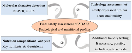 A hybrid that carried event ZDAB3 and its non-transgenic control maize were used in this research. Event ZDAB3 was produced by transforming the inbred corn Hi-II. A homozygous state was achieved by backcrossing the event to the inbred Ruifeng-1 plants. The hybrid of ZDAB3 employed in this research was made by mating this homozygote with an inbred PH4CV. The non-transgenic control maize was a hybrid created by mating Ruifeng-1 and PH4CV. ZDAB3 maize and non-transgenic control maize were planted together during three planting seasons at the same locations (Changxing: 30°53′9″ N longitude, 119°37′57″ E latitude). In a single field, plants were cultivated in the same climatic conditions. At physiological maturity, the grains were collected. The safety assessment process of ZDAB3 corn is shown in Figure 1.