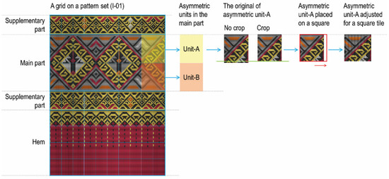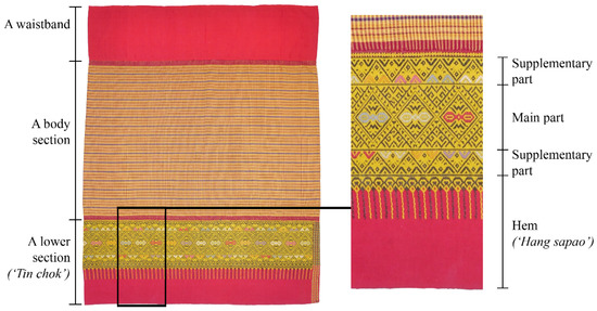 The word “pattern” in this research context refers to a decorative design. A pattern involves the repetition of a motif, or motifs, at regular intervals using rigid motions to fill a flat surface [3,4] (p. 1). “Motifs are any kind of figure, image or illustrative drawing, produced by artists or graphic designers” [3]. Motifs may be either symmetrical or asymmetrical. A symmetrical motif is a figure which is comprised of two or more units of identical size, shape and content [4] (p. 1). Traditional patterns are those considered by indigenous informants to have been produced for several generations by using similar techniques, and those patterns have not undergone significant change even when they have been produced in recent times [5] (p. 581). In any specific cultural group, the people will consistently use specific symmetries and design structures in their cultural design systems [4] (pp. 2, 8, 55), e.g., the patterns in “sin tin chok” from Long district, Phrae province in northern Thailand (Figure 1). Handwoven textiles and cloth-making are meaningful to the Long people, who recognise these as an intangible cultural heritage. “Sin tin chok” was originally designed to comprise three parts: a waistband, a body section and a lower section. Its lower section (“tin chok”) is a woven fabric comprising frieze patterns (Figure 1: right). “Tin chok” is designed to have four parts: a supplementary part, a main part, a supplementary part and a hem (Figure 1: right). We referred to these four parts as “a pattern set”. It is a set of four frieze patterns placed in “tin chok” according to this design structure.