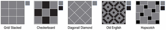 Textile patterns and tiling with tiles share a similar practice, by which motifs/units are regularly repeated on a flat surface [3]. Tiling is the regular repetition of tiles with defined geometric forms without gaps or overlaps between them [3]. In the last two decades, a number of scholars have researched previous collections of tiles and textile patterns, with attempts to understand and describe the structural designs of patterns and tiling, and developed methods, systems and tools for use in redesigning textiles and tile patterns [3,6,7,8]. There is the possibility in the design process to integrate both types of patterns and interchange their characteristics. A tile is a flat piece of hardened material, such as baked clay or stone, that is used for covering a wall, floor or roof [9]. In building construction, tiles can be classified into two main types: wall tiles and floor tiles. Floor tiles are produced from stronger materials than wall tiles. Floor tiles are important materials in building construction and floor decoration [10]. Tiles can be designed in various geometric shapes such as squares, rectangles, diamonds and hexagons. However, a square is seen as a standardised tile shape [11]. A tile shape can inform the tile layout. A layout is an arrangement of diverse units [12]. For example, Figure 2 depicts a square tile that can be arranged in five different layouts: grid/stacked, checkerboard, diagonal/diamond, old English and hopscotch [13]. A tile layout is used as a guide to divide and organise a space and inform the quantity of tiles required for the space.