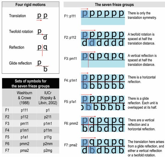 Frieze patterns can be found in many places and products such as architecture, pottery, handwoven textiles and embroidered patterns on clothes. In mathematics, a frieze pattern is a two-dimensional image (with width and length) identified with a motif that is repeated at regular intervals in one direction (e.g., in a horizontal direction) across a flat surface. Every symmetric motif consists of at least two asymmetric units of the same size, shape and content [4] (pp. 1–2). All frieze patterns can be classified into seven groups based on their symmetries [14] (pp. 44, 58–59, 83), [15] (pp. 24–27), [16]. These are known as the seven frieze groups. A frieze pattern is generated as a result of the movement of the original motif using rigid motion(s) on a flat surface in one direction [15] (p. 24). A rigid motion is a transformation of a flat surface where the original motif and its image are congruent in size, shape and content [17] (p. 159). There are four kinds of rigid motions: translation, twofold rotation, reflection and glide reflection, which can generate any pattern [15] (p. 24), [16,17] (p. 159). All frieze patterns necessarily contain translations, but they may or may not contain twofold rotations, reflections or glide reflections. Figure 3 depicts four rigid motions and seven frieze groups. There are many naming systems for frieze groups besides a notable group from a scientific union, i.e., the International Union of Crystallography (IUCr) [18]. Here, we referred to the crystallographic symbols of Washburn and Crowe [14] to classify the seven frieze groups. However, we also compared this naming system to the IUCr, as shown in Figure 3.