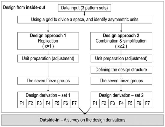 The pattern sets in “tin chok” are frieze patterns, as these patterns are two-dimensional designs that are woven incrementally along the warp threads of a loom, so the fabric’s length increases in one direction [1]. We aimed to design the tile patterns by taking inspiration from the traditional textile patterns in “tin chok”. Here we posed a question: how can the traditional textile patterns in “tin chok” be translated into tile patterns? In this design experiment, we narrowed down the research scope to embrace three conditions. We applied the seven frieze groups as a set of transformation rules in the design process. A square was the only tile shape in this design experiment because it is a standardised tile shape, and several motifs in “tin chok” are identified as square or rectangular shapes. A grid/stacked layout is the only arrangement of tiles that we employed to place square tiles on a flat surface. The research methodology comprised two phases: the design process and the online survey of design derivations because we wanted to gain outsiders’ perspectives (Figure 4). In business and marketing, the terms “inside-out” and “outside-in” refer to opposite strategies for creating value for customers and achieving success [19].