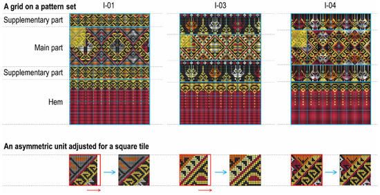 Among the 17 pattern sets, we selected three pattern sets for this design experiment (Figure 5). The three images in the upper part of Figure 5 are the original photographs of the fabric patterns, whereas the other three images in the lower part were generated by computer software (explained above). Note that the three images generated by computer software have a minor difference from the original photographs. That is, the four parts of each pattern set (the supplementary part, main part, supplementary part and hem) have a common vertical reflection axis [1]. In the original photographs, the vertical reflection axes of the main part were not aligned with the two supplementary parts and the hem. Alterations to the vertical reflection axes represent a weaving method that the Long weavers employ at the present time [1].