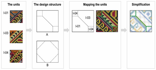 With the three adjusted units (I-01, I-03 and I-04, shown in Figure 9), we intended to combine and simplify their intricate elements in a way that their distinct visual characteristics were retained. As we placed the three adjusted units on the divided areas of design structure A, the different numbers of pixels in the square were not a critical issue. We also rotated, reduced or enlarged the sizing of these three units to ensure that their distinct characteristics remained in the whole design. These three units became different in size, but this was not a critical issue either. This was because in the next step there was a simplification process, in which we applied a grid to divide the whole design space to comprise 27 × 27 pixels and used it as a guideline to simplify the intricate elements. (Twenty-seven was the maximum number identified from the units after cropping or stretching). Finally, the intricate elements were simplified by retaining their distinctive lines and shapes, removing several detailed elements, adjusting parts of the lines or shapes and correlating them with the whole design. Additionally, we applied a new colour scheme to the new design unit so that it was different from the original patterns.