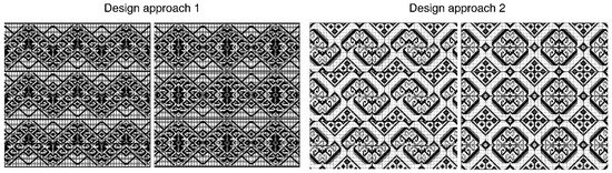 By magnifying the three original photographs (Figure 5, the upper part), one can see the many threads that form the pattern elements, such as triangles and diamonds, which can be identified by the different colours of threads. It is obvious that the edges of the pattern elements are not smooth. Regarding the replication of information from the original photographs, one may ask why not use a vector graphic software to draw the outlines of these pattern elements as geometric shapes so that their edges are smoothened. We preferred not to do so as it is obvious that the edges of these patterns in real fabrics are not smooth. In this design experiment, we avoided any loss of information; therefore, we retained the pixelated characteristics and directly translated them into the design of tile patterns.