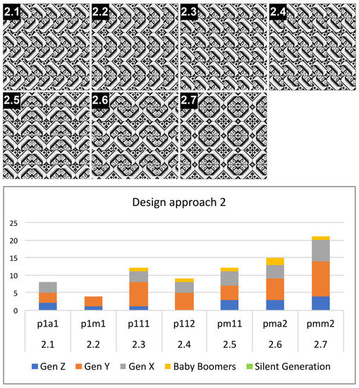 Survey question 4 probed the respondents’ preferences for the seven frieze patterns resulting from the selected design approach (Table 3 and Table 4). Figure 14 and Figure 15 show the seven frieze patterns (from design approaches 1 and 2, respectively) and the respondents’ preferences for these patterns. Overall, they preferred the pattern designs that were connected all-around as a closed path, i.e., a visually larger object. From survey question 5, their rationale for their selection was summarised as follows. The patterns from design approach 1 (partial replication) had some original characteristics that were not changed too much, but these patterns looked trendy or contemporary and could be applicable to other products. These selected patterns showed a continuity, neatness, symmetrical balance and harmony in their designs, which were not too complex or confusing to look at. Similarly, the patterns from design approach 2 (combination and simplification) showed a connectedness and neatness in their symmetrical design. These patterns looked simple and not too complicated. They looked trendy, contemporary and classic as a result of the design layout, design elements and their sizing.