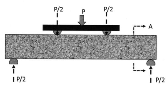 ASTM D790 and ASTM C78 determine flexural strength using a two-point loading test. This method determines the flexural strength of hardened concrete test specimens by two-point loading [57,58]. Figure 3 shows a schematic of a flexural machine with two supports and two loads. Two supports considered as simply supported. The specimen’s center was loaded and then two points until failure. The flexural test machine directly measured the load.