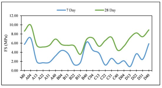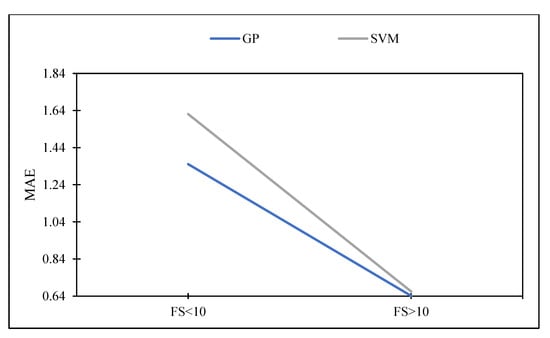 In addition, based on the examination of the data, the set of data has been separated into two groups, which are FS < 10 MPa and FS > 10 MPa. Table 11 and Figure 12 show the increasing trend in error with decreasing FS based on the modelling methodologies that were used, and they indicate that the error increases from 0.6411 to 1.3511 MPa for FS > 10 to FS < 10, respectively, for GP based model.
