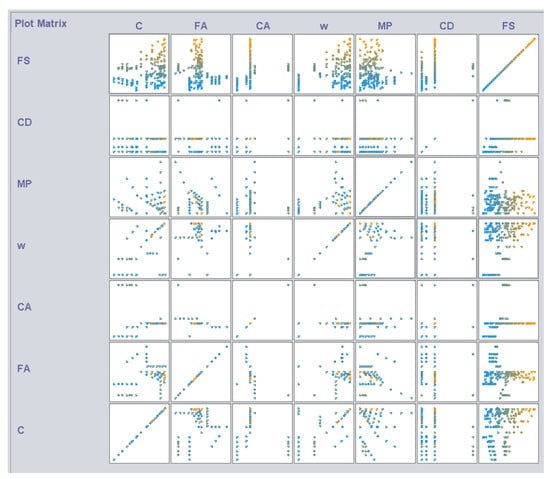 Figure 5, show how distinct each data point’s colors are. The color alterations on the pair charts depend on the output’s level of intensity. Figure 5 shows how the color for flexure strength, which ranges from 0.4 MPa to 11.73 MPa, varies from blue to orange depending on the intensity of the output. As a result, each data point’s color is unique for each variable and ranges from blue at 0.4 MPa to orange at 11.73 MPa. In addition, Figure 5 illustrates a pair plot that was created to visualize the given dataset and discover their relationship. Figure 5 depicts the complex relationship that exists between the flexural strength of concrete and the constituent elements of marble powder, curing days, water, and cement. As can be seen, an increase in the dependent variables such as cement, water, marble powder, and curing days has an effect on the FS of the concrete.