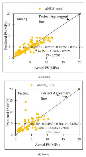 Trial-and-error is used in the development of ANFIS-based models. Matlab can be used to predict FS. The model used in the study is triangular. The performance metrics for each membership function-based ANFIS model are listed in the later section. ANFIS model based on triangular membership function (MFs) predicts FS of concrete mix containing WMP. The CC values for training and testing were 0.8592 and 0.4687, respectively. The RMSE, MAE, RAE, and RRSE values were 1.3351 and 2.5116, 0.8487, 39.77% and 59.93%, respectively. Figure 6 illustrates observed and predicted ANFIS-based results for both phases. These numbers show how well the ANFIS trimf-based model predicts the FS of concrete mixes containing WMP. Reliable outcomes are predicted by a value that is closer to the line of perfect agreement [71,72,73,74,75,76].