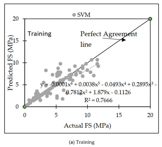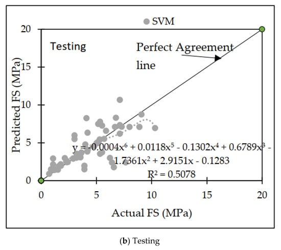 The Pearson VII function kernel, often known as the PUK kernel, is used in this model along with a number of user-defined parameters, such as C, omega (O), and sigma (S). The ideal method, which involved getting the maximum CC value while also minimizing the number of errors, was found after a substantial number of experiments were run [77,78,79,80]. The dataset that was used in this investigation yielded the most successful outcomes, with a c value of 1.5, O = 0.7, and S = 0.7, respectively. The performance metrics of the SVM are listed in Table 9, and it includes both the training and testing datasets. The RRSE was 50.88 percent during the training phase and 78.36 percent during the testing phase. The RAE was 31.49 percent during the training phase and 61.61 percent during the testing phase. The MAE was 0.6720 during the training phase and 1.1604 during the testing phase. The CC values were 0.8656 and 0.7020. A comparison of the actual and anticipated FS values of the concrete mix resulted in the creation of the agreement plot, which is depicted in Figure 7.