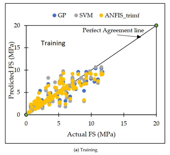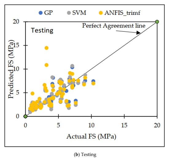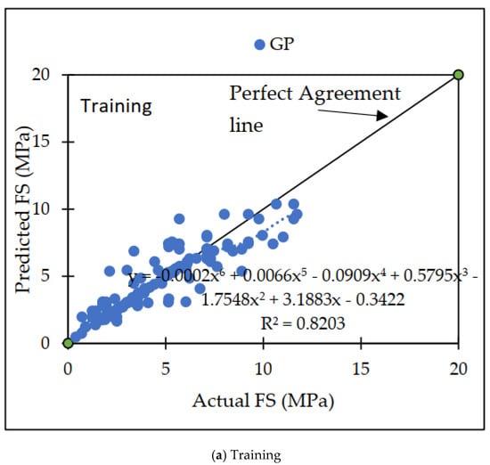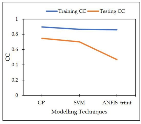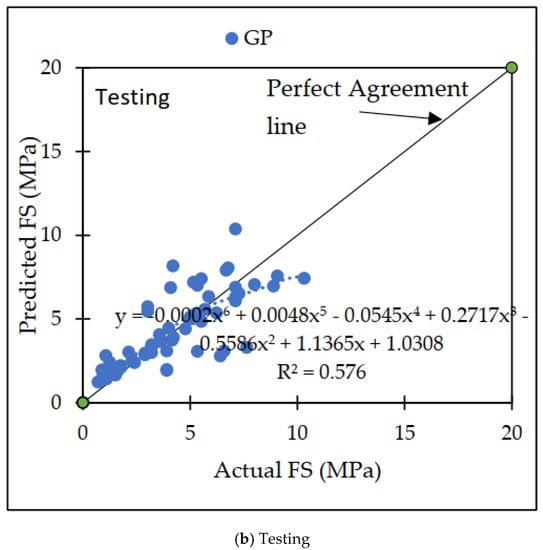 Throughout the course of this investigation, a variety of distinct strategies for machine learning were utilized. The GP model appears to outperform the others when these models are compared, both in terms of the training datasets and the testing datasets [65]. Both the training dataset and the testing dataset showed that the GP model had the greatest possible CC values of 0.8967 and 0.7476, respectively, for the testing dataset. Figure 9a,b illustrates the disparity that exists between the projected dataset and the actual dataset on which machine learning methods were performed.