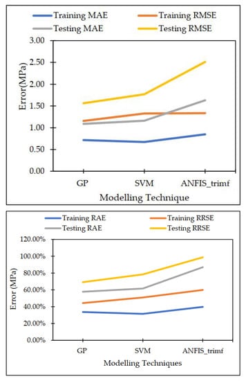GP model also had the lowest MAE (1.0884), RMSE (1.5621), RAE (57.79%), and RRSE (69.19%) for the testing dataset. These results can be seen in Table 9 and Figure 10.
