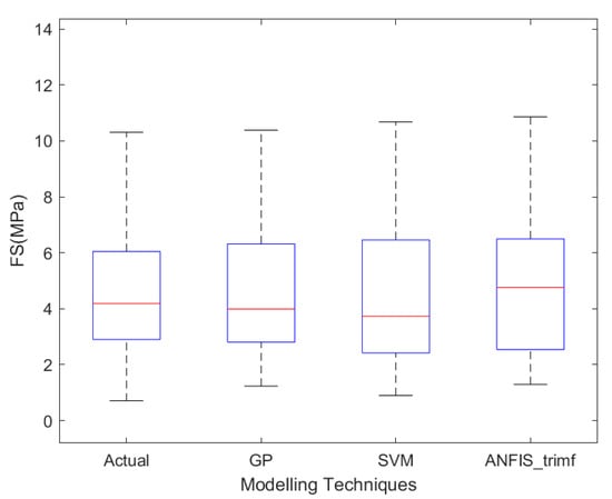 In order to determine the FS of concrete mix that included MP, it was necessary to evaluate not only the actual value but also the quartile values of 25%, 50%, and 75% in addition to the actual value. Table 10 displays the findings obtained from the aforementioned assessments. Interquartile range (IQR) of GP is relatively near to IQR of the real data that was followed by ANFIS trimf, as can be shown in Figure 11 and Table 10, respectively.