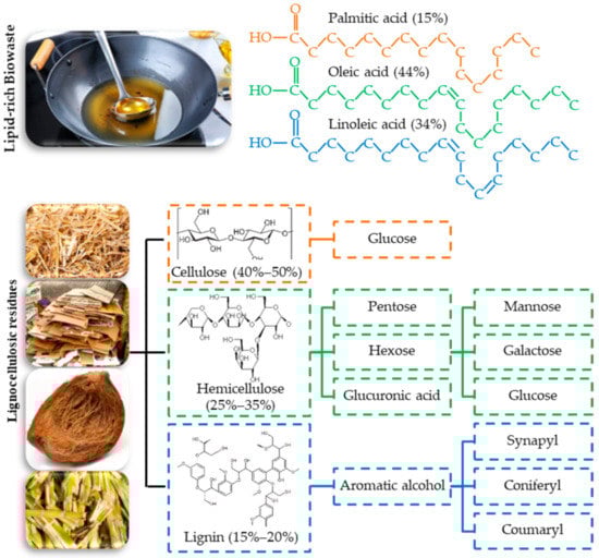 Representation of the chemical structure and composition of the main compounds in lipid-rich biowaste (WCO) and lignocellulosic residues.