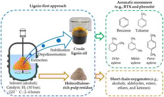 - Renders, T.; Den Bossche, G.V.; Vangeel, T.; Van Aelst, K.; Sels, B. Reductive catalytic fractionation: State of the art of the lignin-first biorefinery. Curr. Opin. Biotechnol. 2019, 56, 193–201. [Google Scholar] [CrossRef]