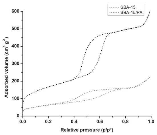 Figure 1 shows the nitrogen adsorption isotherms obtained for SBA-15 and SBA-15/PA; the samples presented type IV(a) isotherms according to the updated IUPAC classification [39,40,41]. At medium relative pressures, capillary condensation began and H1-type hysteresis loops were generated, which are associated with mesoporous solids with cylindrical pore channels. For SBA-15/PA, the hysteresis loop is H5 type, which is associated with pore structures containing open and partially blocked mesopores. The incorporation of polyaniline in the pores of the silica explains the decrease in the amount of nitrogen adsorbed; this behavior is due to the limitation of the diffusion of nitrogen molecules that generate the surface groups located in the openings of the pores [42].