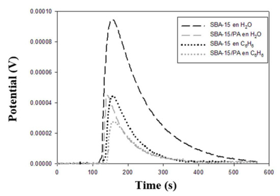 Figure 2 shows the potentiograms from the immersion calorimetry in water and benzene of SBA-15 and its modification. The polarity of the surface of the silicas could be evaluated based on the fact that the proportion of hydrophobicity and hydrophilicity of a surface can be estimated using the relationship with the enthalpies of immersion in a polar and a nonpolar liquid, such as water and benzene. As the values of the enthalpy of immersion in water of SBA-15 and SBA-15/PA were greater than those of the enthalpy of immersion in benzene, the surfaces were considered hydrophilic. However, the formation of hydrogen bonds between the water molecules and the silanol groups of SBA-15 generated an enthalpy value of 31.2 J g−1, and upon reducing the amount of silanol groups in SBA-15/PA by shielding the polyaniline molecules located in the polar sites of the surface of the silica, the enthalpy of immersion in water was reduced to 20.4 J g−1 [39,40,41,42,43,44,45,46,47,48,49].
