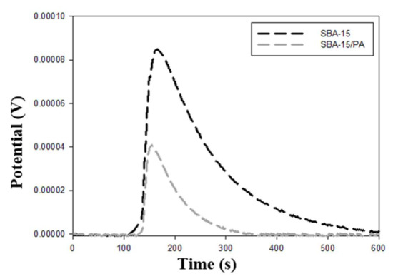 There is a directly proportional relationship between the enthalpy of immersion and the surface area of the silicas, with the greater 28.1 J g−1 enthalpy of immersion for SBA-15, because when there is a wider space for the entrance of molecules, greater interaction of the adsorbate with the porous structure is generated. The immersion enthalpy value for SBA-15/PA decreased to –15.1 J g−1. This shows that there was a reduction in porosity due to the fixation of the functional groups on the surface [45,46,47,48,49].
