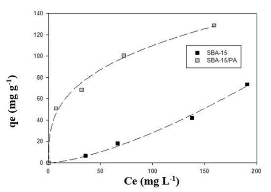 The experimental results with the adsorbents at a constant temperature in equilibrium conditions were tested with various isotherm models (Langmuir, Freundlich, Sips, Tòth, and Redlich–Peterson isotherms) to establish the adsorption mechanisms. The testing of Langmuir and Freundlich isotherms is essential, since it reveals whether the adsorbent surface has a specific number of active sites which come in contact with adsorbates to form a permanent attachment. The test of the Langmuir isotherm ascertains physical adsorption, whereas the test of the Freundlich isotherm determines chemical adsorption, and they also facilitate the determination of adsorption mechanisms. SBA-15 and SBA-15/PA had interesting adsorption capacities and comparable adsorption capacities with respect to other adsorbents; therefore, these adsorbents are suitable for practical use.