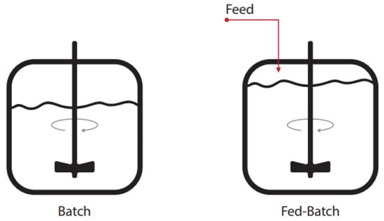 In the production of biologics, there are several types of cell culture modes such as batch, fed-batch, concentrated fed-batch, and continuous (perfusion or chemostat). Batch production refers to the culturing of cells within a vessel that are grown with an initial known concentration of feed source and medium [13,14]. No further nutrition addition or removal is performed on the system. As the biomass within the vessel grows, the initial feed source begins to be depleted while metabolic waste and product are accumulated in the medium [13]. Even though this form of cultivation has drawbacks, such as limiting the maximum cellular density that can be achieved and limiting the culture run time due to accumulation of metabolic waste, it is a relatively simple arrangement that does not require complex control loops in order to manage subsequent feeding or removal of waste [15]. In a fed-batch operation, nutrients are fed continuously or periodically (bolus) to the system to supplement reactor contents and control overall substrate concentrations [13,15,16,17,18,19]. Constant measurement of relevant metabolic products and feed source concentrations is needed to have knowledge of the relevant feed additives that are critical for the cell culture. This mode is widely used in the industry since it is excellent for the production of non-growth-associated products as well as providing a strong alternative to complex continuous feeding regimens [13,15,16,17,18,19]. Additionally, it is used to control substrate concentrations since high levels can be inhibitory or can cause shifts in the metabolic pathways [14]. It is important that space is allowed in the system to permit medium addition. Two main methods exist for fed-batch: the constant feeding strategy and the constant substrate concentration strategy [14]. With the constant substrate concentration strategy, a constant growth rate can be initially maintained and the number of cells in the bioreactor will, thus, increase exponentially as a function of time. However, it also means that the system must be supplied exponentially with substrates. Even with concentrated feed, this can cause significant volume changes in the systems. Because of this, maintaining the feed rate constant is used as a viable alternative even though the system rapidly may become substrate limited [14]. Practically, industry often uses periodic feeding (bolus) due to its simplicity and high efficiency [14,15,16,17]. The batch and fed-batch modes are depicted in Figure 2.
