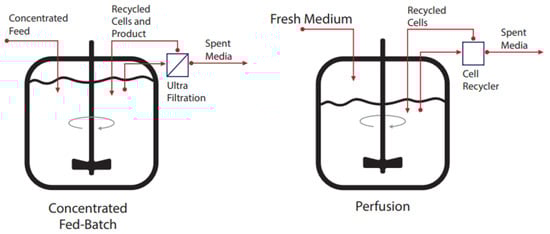 Concentrated fed-batch and perfusion modes of operation. Perfusion systems continuously replenish medium into the reactor while spent media are continually extracted. Cells are separated from the extracted media and recycled back into the stirred tank reactor. In a concentrated fed-batch system, concentrated feed formulations are added while extracting spent media. However, an ultrafiltration module is used to recycle back both cells and product into the system.