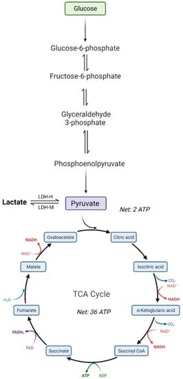Schematic of the glycolysis pathway and TCA cycle. Two ATPs are formed in the glycolytic pathway while 36 ATPs are generated through the oxidative pathway.