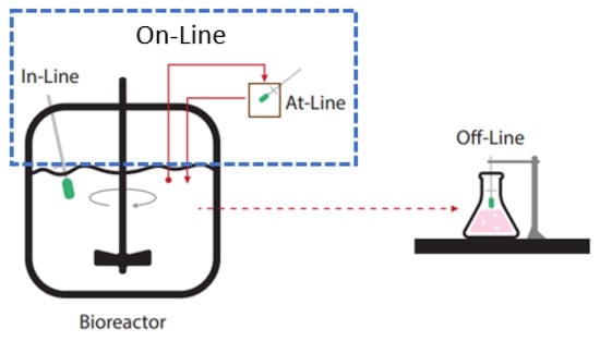 These sensors vary in application depending on how they are connected to the bioprocess (Figure 5). If they share a direct interface with the culture, they are denominated in-line sensors [41,42,43,44]. These sensors are also referred to as in situ sensors and do not require any type of manual or autonomous sampling. If the sensor module lies in close proximity to the production process and manual or automatic sampling is required to analyze the predetermined variables, then the sensors are denominated at-line [41,42,43,44]. If the data are analyzed in a continuous fashion, the sensors are determined to be on-line sensors [41]. The continuity of the measurement depends on the response time of the signal and the flow rate of the sampling procedures, which must be small when compared to the dynamics of the process. Thus, if the data points generated from the sensor occur at spaced-out time intervals, the sensor is determined to be quasi on-line [41]. Alternatively, if a sample is required to be taken off the system and analyzed in the laboratory after proper pre-treatments (e.g., dilution, filtration, or digestion), the employed sensor is determined to be off-line [44]. These sampling events, whether at-line or off-line, need to maintain rigorous sterility standards to prevent contamination and protect the cell culture [44]. Given that the isolated sterile bioreactor compartment has to be opened and a sample has to be withdrawn, cell-free sampling is usually assured by sterile barriers, such as microporous filters [44]. For the purpose of process control, on-line measurements are desirable given the fact that the data can be readily used in feedback control loops that regulate the process [41,42]. For the sensor to be considered on-line, the sensed variable must be measured more frequently than it can change in the process. In the case of mammalian cell culture, metabolic rates are slower when compared to microbial cultures. Thus, it is expected that substrate concentrations or metabolic by-products are subjected to low variations within a 1-h period. Consequently, a sensor capable of detecting metabolite concentrations every 30 min can be considered to be on-line because enough time is given to the system to gather and act on the received data through the established control loop [42].