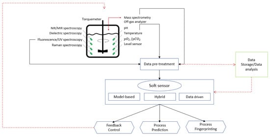 A soft sensor is a term used to describe an approach that employs hardware devices and software-implemented models to gather new information about the process that would otherwise be impossible to derive exclusively with hardware sensor measurements [131,132,133,134]. In essence, these novel arrangements are employed with the purpose of using easily accessible on-line data to infer quantitative information about process variables that are difficult to measure directly or can only be measured at low sampling frequency [135]. Soft sensors can, thus, become useful for both monitoring and control applications in the bioprocessing industry if they are demonstrated to be robust and easy to implement [131,132,133,134]. In theory, a soft sensor should result in reduced need for extensive operational surveillance and educed maintenance work and should increase the interpretability of the results given the capacity of the models to relate various key variables. Because of this, soft sensors are perfect candidates for the PAT initiative and to contribute towards automated control [135]. Broadly speaking, soft sensors can be split into three global categories: data-driven sensors, model-driven sensors, and hybrid models [116].