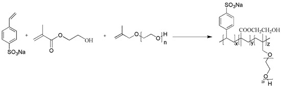 Water, ethanol, hydroxyethyl methacrylate and sodium p-styrene sulfonate were added into a flask. Methacrylol polyoxyethylene ether and ammonium persulfate solution were added. The reactions were protected with nitrogen and the temperature kept at 70 °C. The products were purified by dialysis bag. Terpolymers were obtained after being dried in a vacuum freeze dryer [2,5,6]. Figure 2 shows the synthetic route of the polysulfonate dispersant. The structure of the polysulfonate dispersants was analyzed by Fourier infrared spectroscopy and 1H NMR.