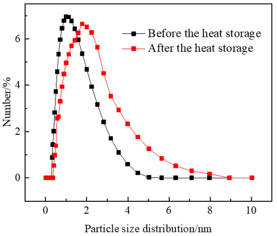 Pendimethalin has a melting point of 54~58 °C and is easily crystallized by heat at continuous storage over 14 days in (54 ± 2.0) °C. A variety of conventional agricultural dispersants, such as lignin sulfonate, sodium naphthalene sulfonate formaldehyde condensate, alkylphenol ethoxy ether phosphate, etc., have been used in formula screening, but have not solved the problem of thermal storage crystallization. Figure 10 shows that the average particle size after adding 10% polysulfonate dispersant is 1.152 um, and the average particle size after the heat storage is 1.7469 um. The effect of heat storage on pendimethalin particle size indicates that there is no obvious growth of crystals during the heat storage process, and the polysulfonate dispersant has a good dispersing effect on pendimethalin particles and effectively prevents the agglomeration of pendimethalin particles.