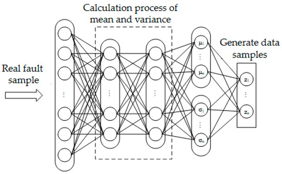 The variational self-coding network constructs the encoder based on the effective loss standard, so that the extracted features obtain a good topology similar to the input data, and the encoded output features are used as the synthesis standard of the decoder, identify the differences between the output and input data according to the appropriate objective function, and shorten the distance between the targets by modifying the weight and bias parameters. The probability distribution of the real fault set obtains the potential expression of the input samples, including mean and variance, through KL divergence learning distribution and coding calculation, so that the generated samples are similar to the real fault samples. The variational self-coding network model is shown in Figure 2.