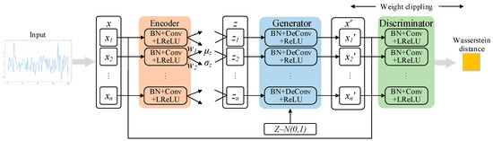Figure 7 illustrates the detailed architecture of the encoder, decoder, and discriminator of the VAE-WGAN model proposed in this paper. The encoder, decoder, and discriminator share the same architecture. For the training experiment in this section, the model uses a convolution structure, the convolution kernel size is 3, and the post-convolution with a stride of 2 is used to amplify the data of the discriminator. The filling functions are all SAME to ensure that the data size dimensions are consistent, and the data is normalized before the activation function is activated. Post-convolution is realized by turning the direction of convolution. The model is trained using RMSProp with a learning rate of 0.0003 and a step size of 64.