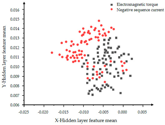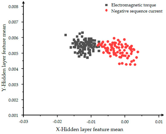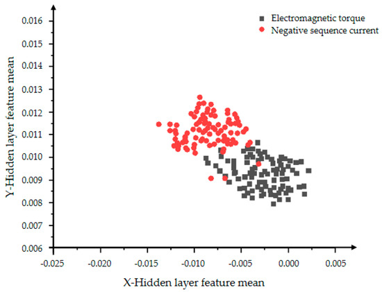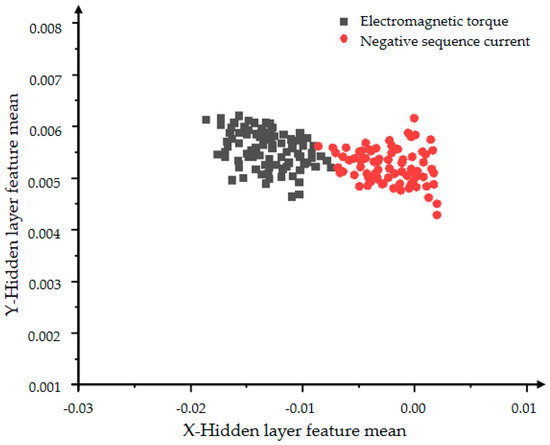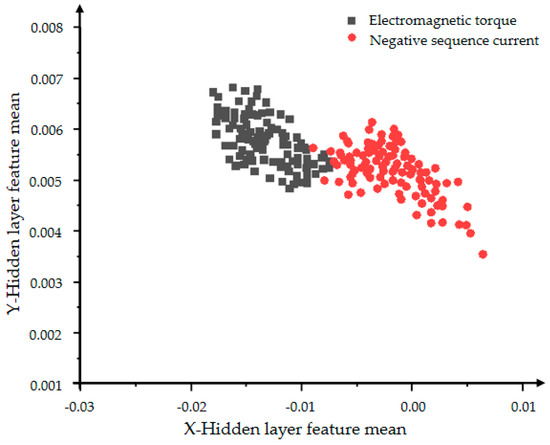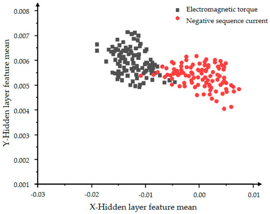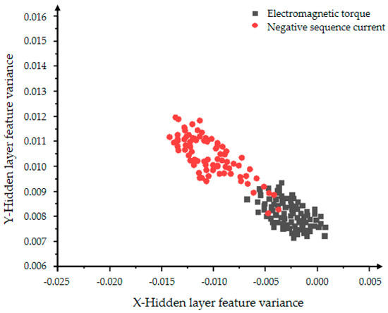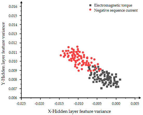 In Figure 10 and Figure 11, the red dots represent the hidden layer characteristic variance of the negative sequence current in the inter-turn short circuit state, and the black dots represent the hidden layer characteristic variance of the electromagnetic torque in the inter-turn short circuit state. Figure 10 shows a very obvious classification effect, but the data is less centralized and the features are more scattered. As the number of iterations in Figure 11 increases, the aggregation and convergence of the data are also improved to a certain extent, and the classification effect is also obvious.