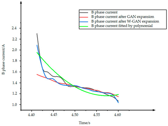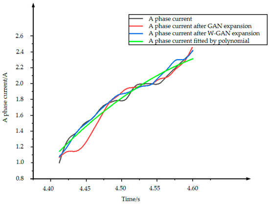 Figure 14 shows the original data and three types of expansion data of B phase current. The data expanded by GAN loses the characteristics of the original data from 4.4 to 4.48 s. Because the current tends to drop sharply near 4.42 s, the data fitted by polynomial cannot express the characteristics of the original data better, but the data expanded by WGAN can still maintain a good fit with the original data. Figure 15 shows the CORREL function values of the three expansion methods for B phase current. The WGAN fitting degree is the best, and the CORREL function value is 0.986, followed by GAN and polynomial fitting.